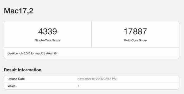 从常规性能的角度来看,M5芯片只能算作苹果生态内的一次稳步迭代。在MacBook Pro中,这颗芯片获得了单核心4339、多核心17787的成绩,这一成绩相比上一代M4芯片有一定程度的提升。