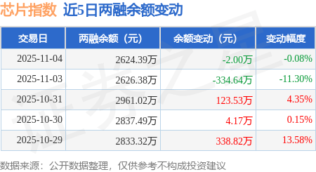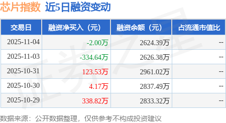 证券之星消息,11月4日,芯片指数(159599)融资买入338.12万元,融资偿还340.11万元,融资净卖出2.0万元,融资余额2624.39万元,近20个交易日中有13个交易日出现融资净买入。