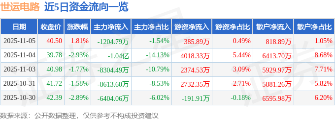 证券之星消息,截至2025年11月5日收盘,世运电路(603920)报收于40.5元,上涨1.81%,换手率2.74%,成交量19.75万手,成交额7.8亿元。