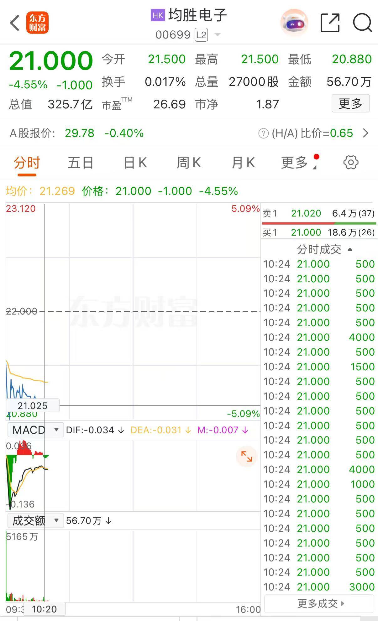 11月6日,A股上市公司均胜电子登陆港交所,募资总额约34.12亿港元。上市首日,均胜电子开盘后一度跌超5%,最低报20.88港元/股。截至10点20分,均胜电子跌4.55%,报21港元/股,总市值约325.7亿港元。