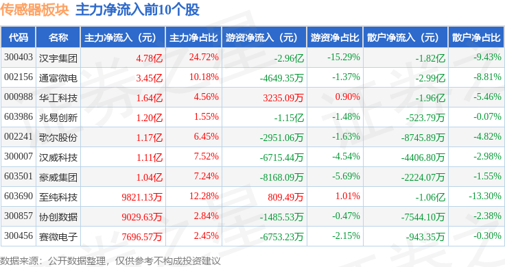 从资金流向上来看,当日传感器板块主力资金净流入17.52亿元,游资资金净流出8.92亿元,散户资金净流出8.61亿元。传感器板块个股资金流向见下表: