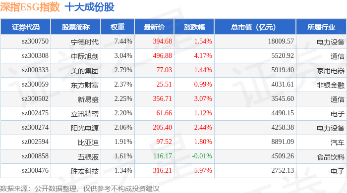 证券之星消息,11月6日,深指ESG(970026)指数报收于14314.81点,涨1.73%,成交4630.83亿元,换手率1.77%。当日该指数成份股中,上涨的有280家,赛微电子以13.14%的涨幅领涨,下跌的有110家,卫宁健康以10.38%的跌幅领跌。