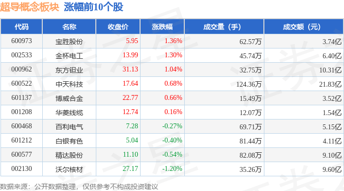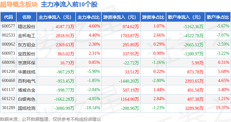 从资金流向上来看,当日超导概念板块主力资金净流出7.57亿元,游资资金净流入2.57亿元,散户资金净流入5.0亿元。超导概念板块个股资金流向见下表: