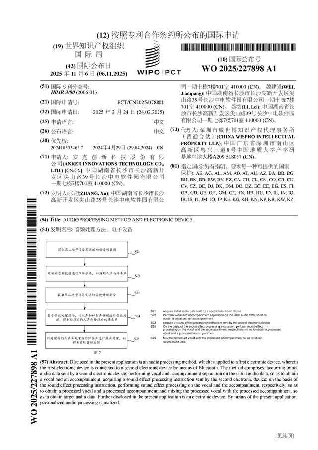 证券之星消息,根据企查查数据显示安克创新(300866)公布了一项国际专利申请,专利名为“音频处理方法、电子设备”,专利申请号为PCT/CN2025/078801,国际公布日为2025年11月6日。