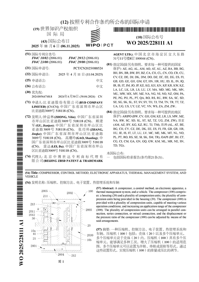 证券之星消息,根据企查查数据显示比亚迪(002594)公布了一项国际专利申请,专利名为“压缩机、控制方法、电子装置、热管理系统和车辆”,专利申请号为PCT/CN2025/088524,国际公布日为2025年11月6日。
