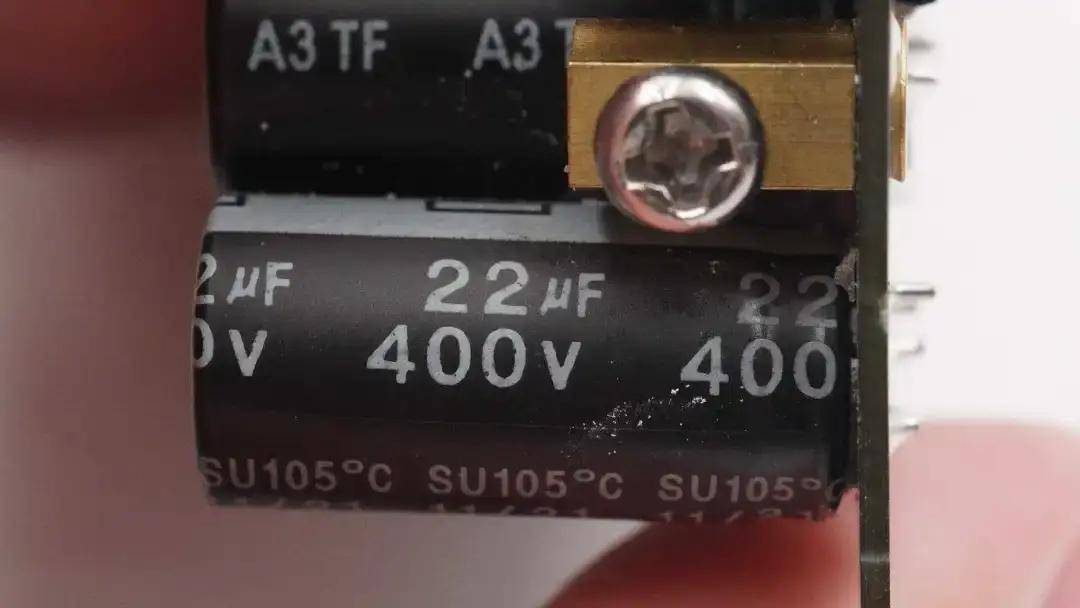 两颗电容均是永铭KCX系列,规格分别为400V 33μF和400V 22μF。