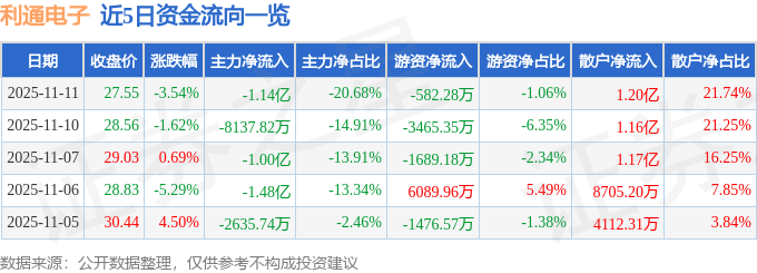 证券之星消息,截至2025年11月11日收盘,利通电子(603629)报收于27.55元,下跌3.54%,换手率7.73%,成交量19.82万手,成交额5.5亿元。