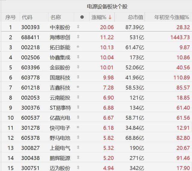 A股市场电源设备股集体走强,其中,中来股份20CM涨停,海博思创涨超11%,拓日新能、协鑫集成、金辰股份、国晟科技10CM涨停,吉鑫科技涨超7%,云南能投、亿晶光电、快可电子涨超6%,野马电池、上能电气、鹏辉能源涨超5%。