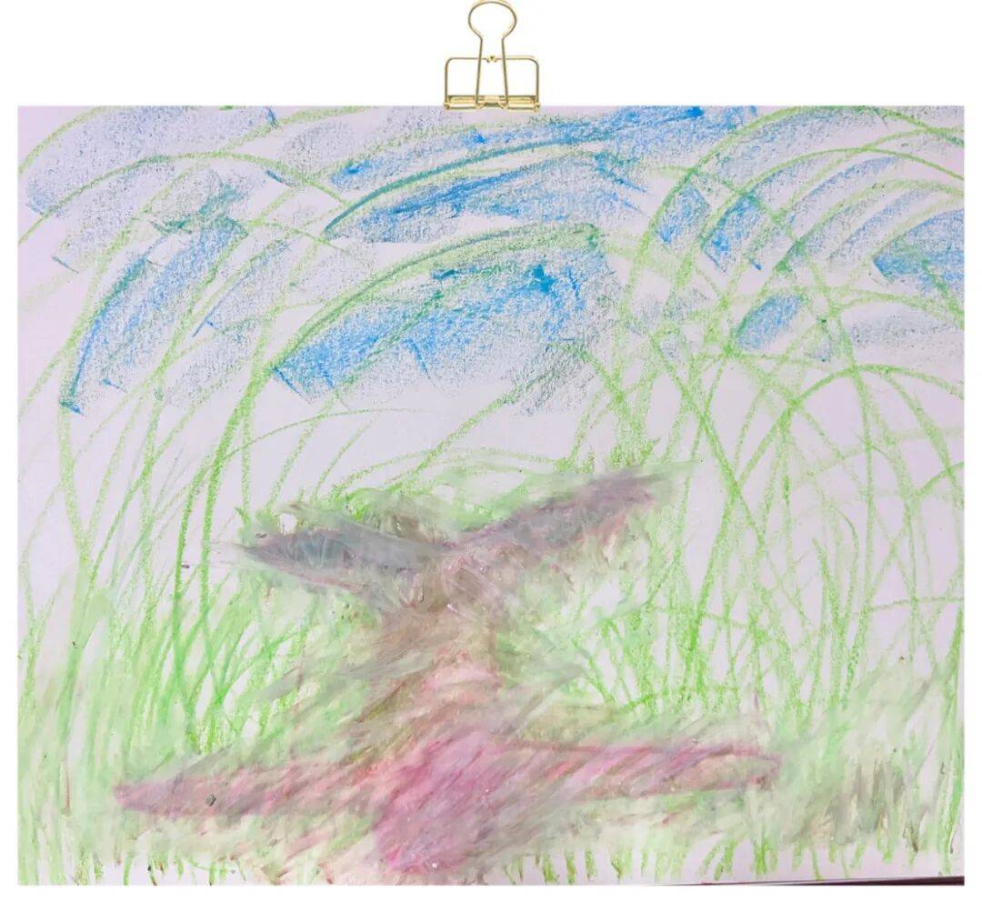 我最后的冥想在一片绿草坪,我站在上面看到了云和蓝蓝的天,然后我被包裹着,我感觉草地慢慢地露出了我的身体,好像我被小草托着,最后小草把我包裹住了,我觉得我快融入进去了。我的画用白色把这个人给涂掉了,因为我发现好像我的自我消失了,最后归于了草,我融入了进去。之前好像要证明我是我,但是当我放弃了这个念头,我只想要平静的时候,我就会消失。