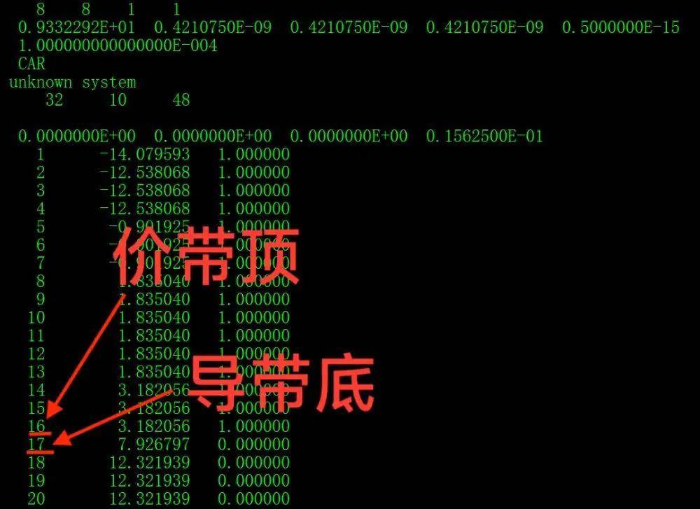 先看一下本征值文件 EIGENVAL 中价带顶和导带底这两条带对应的能带编号