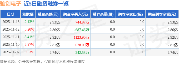 雅创电子融资融券信息显示,融资方面,当日融资买入6503.95万元,融资偿还5758.98万元,融资净买入744.97万元。融券方面,融券卖出0.0股,融券偿还0.0股,融券余量0.0股,融券余额0.0万元。融资融券余额2.93亿元。
