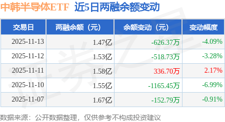 证券之星消息,11月13日,中韩半导体ETF(513310)融资买入1.01亿元,融资偿还1.07亿元,融资净卖出626.37万元,融资余额1.47亿元。
