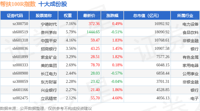 帮扶100R(480065)指数十大成份股详情如下: