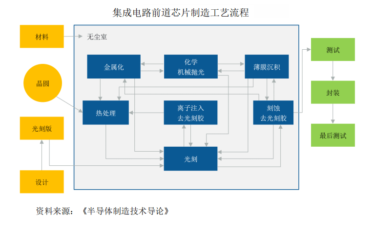 集成电路制造设备通常可分为前道工艺设备(芯片制造)和后道工艺设备(芯片封装测试)两大类。其中,前道芯片制造主要包括六大工艺步骤,分别为:热处理、光刻、刻蚀、离子注入、薄膜沉积、机械抛光,所对应的专用设备主要包括快速热处理/氧化/扩散设备、光刻设备、刻蚀/去胶设备、离子注入设备、薄膜沉积设备、机械抛光设备等。