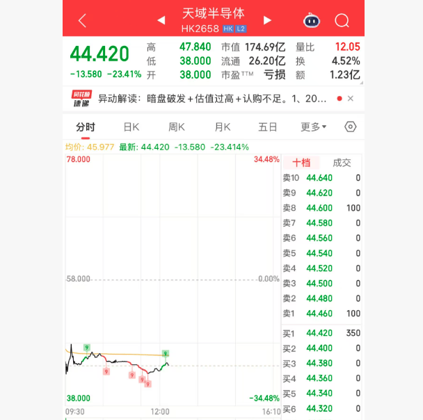 12月5日,天域半导体正式在港交所主板挂牌上市,以38.00港元/股开盘,较发行价低34.48%。截至13时13分,天域半导体报44.42港元/股,跌23.41%,市值约175亿港元。