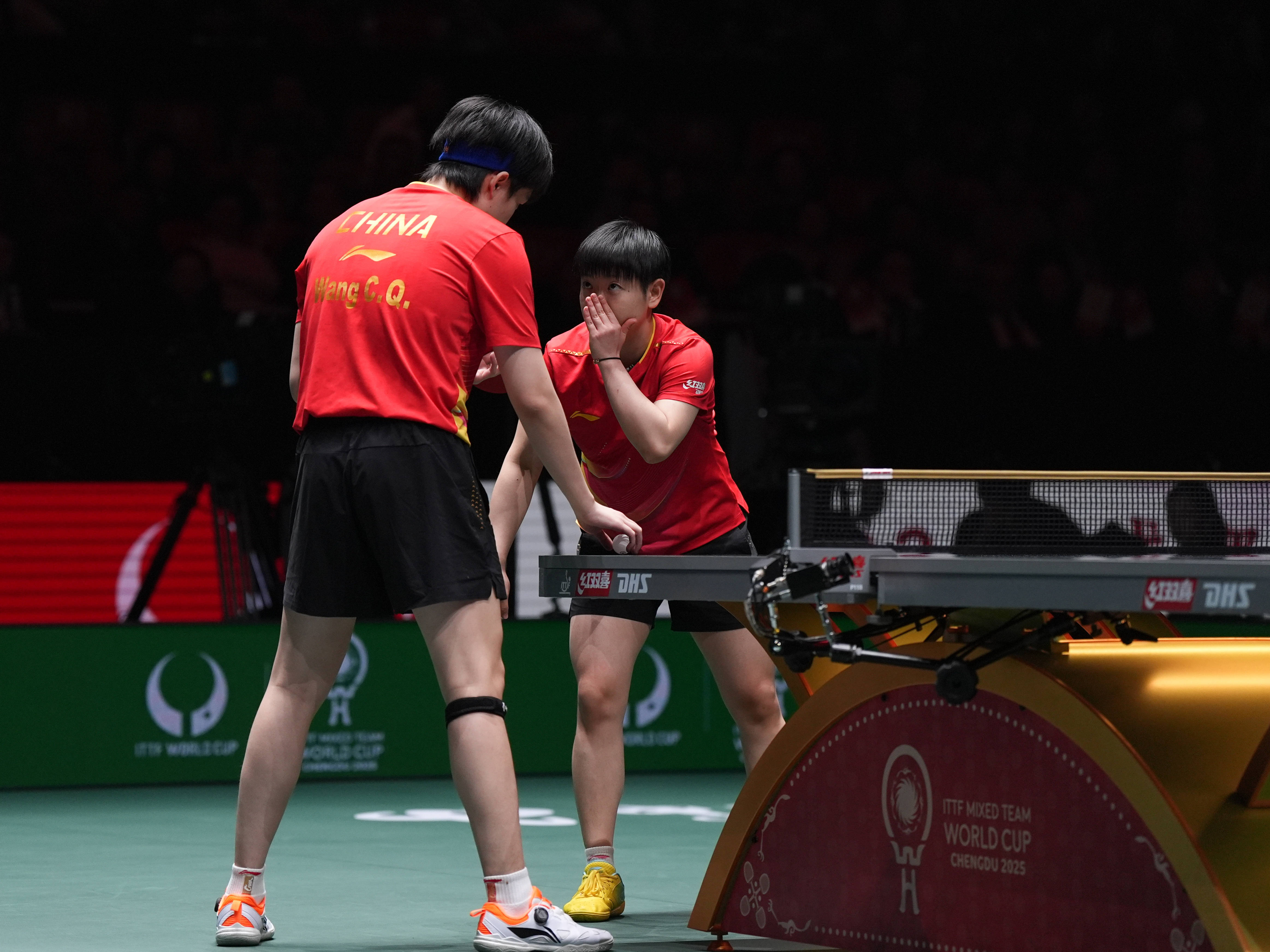 12月7日,中国队组合王楚钦/孙颖莎(右)在混双比赛中商讨战术。他们3比0战胜日本队组合松岛辉空/大藤沙月。 新华社记者 王曦 摄