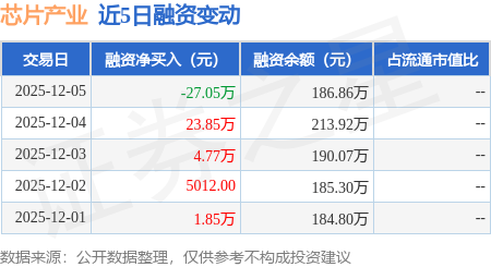 证券之星消息,12月5日,芯片产业(159310)融资买入110.46万元,融资偿还137.51万元,融资净卖出27.05万元,融资余额186.86万元。