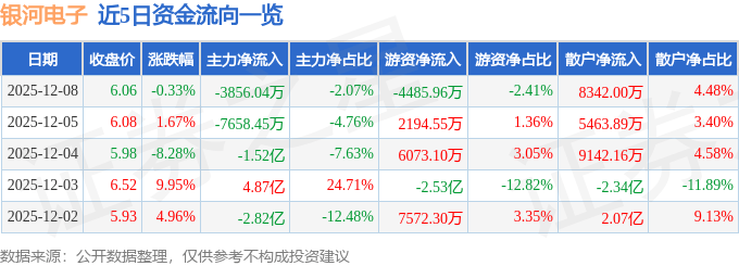 证券之星消息,截至2025年12月8日收盘,银河电子(002519)报收于6.06元,下跌0.33%,换手率26.98%,成交量301.83万手,成交额18.6亿元。