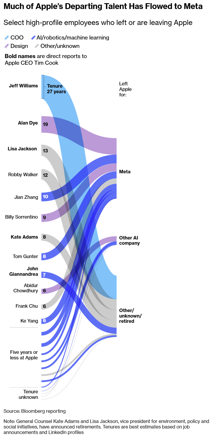 在此之前,苹果还有多位高管离及AI、硬件相关人才也纷纷跳槽到了Meta、OpenAI等企业。