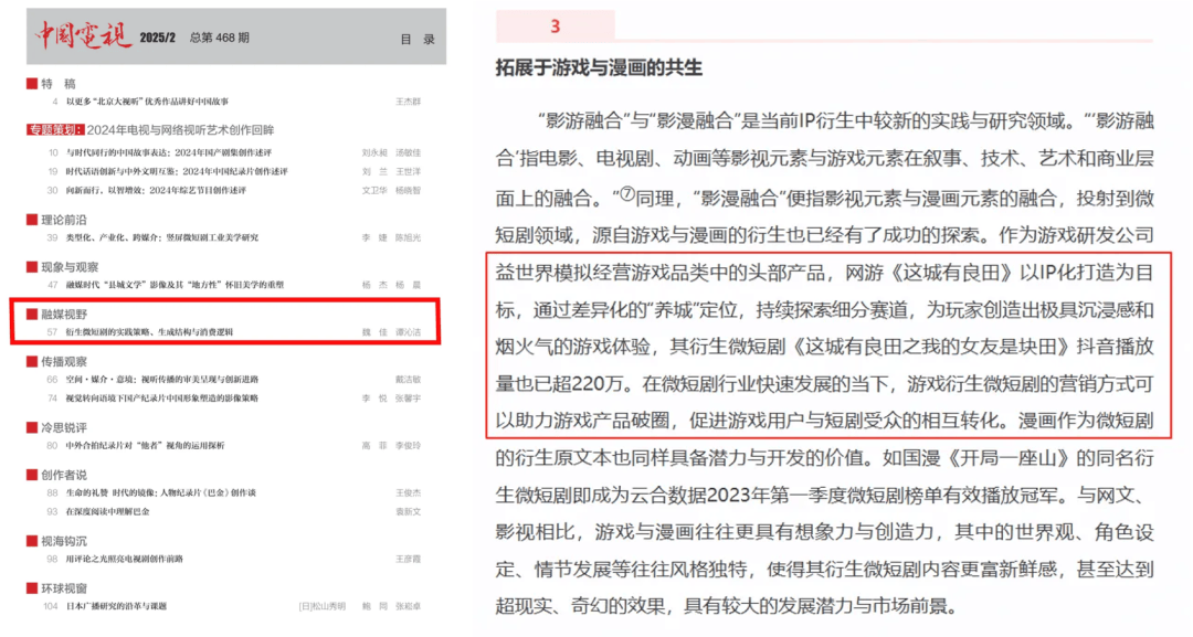 近年来,跨媒介叙事成为激活IP生命力的创新策略之一,除动画短片、电影、电视剧外,当下正火的短剧也成为游戏传播的主要媒介。腾讯旗下「王者荣耀」、网易旗下「逆水寒」以及益世界旗下「这城有良田」等游戏都曾推出过短剧。今年,益世界「这城有良田」同名短剧——《这城有良田之我的女友是块田》作为“游戏+短剧”融合创新案例被权威期刊《中国电视》纳入研究。
