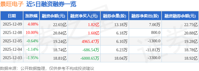 景旺电子融资融券信息显示,融资方面,当日融资买入5.04亿元,融资偿还3.23亿元,融资净买入1.82亿元,净买入额两市排名第5,连续3日净买入累计3.91亿元。融券方面,融券卖出7.14万股,融券偿还1400.0股,融券余量13.18万股,融券余额937.49万元。融资融券余额22.75亿元。