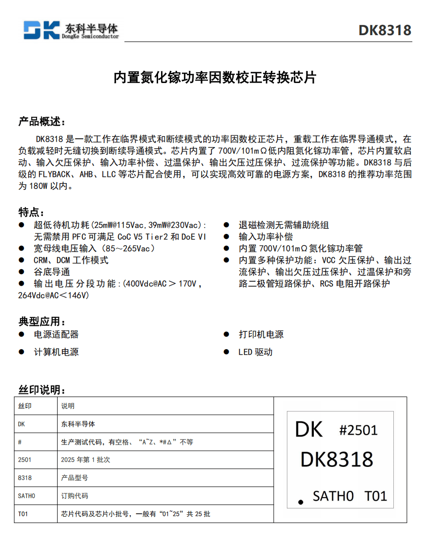 DK8318 这类集成合封 GaN PFC 方案,有助于降低工程团队驾驭高频 GaN 与高功率因数设计的门槛,加快高功率密度、小型化电源在适配器、显示器电源以及 LED 驱动等领域的升级迭代。