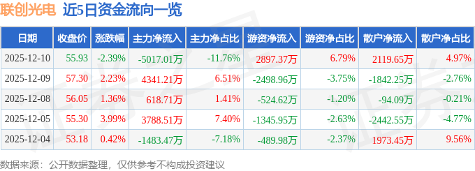 证券之星消息,截至2025年12月10日收盘,联创光电(600363)报收于55.93元,下跌2.39%,换手率1.69%,成交量7.64万手,成交额4.27亿元。