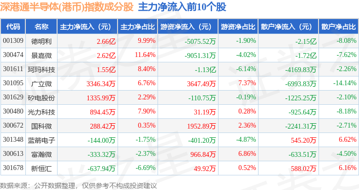 资金流向方面,深港通半导体(港币)(983068)指数成份股当日主力资金净流出合计14.95亿元,游资资金净流入合计3.77亿元,散户资金净流入合计11.18亿元。成份股资金流向详情见下表: