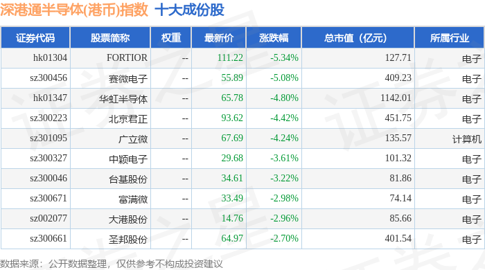 深港通半导体(港币)(983068)指数十大成份股详情如下: