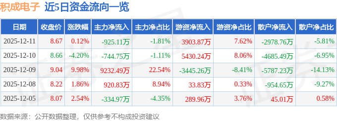 证券之星消息,截至2025年12月11日收盘,积成电子(002339)报收于8.67元,上涨0.12%,换手率12.23%,成交量58.55万手,成交额5.12亿元。
