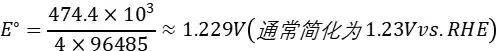 标准电极电势(E∘)是指在标准条件(298 K、1 bar气体压力、1 mol/L溶液浓度)下,以标准氢电极(SHE,电势定义为0 V)为参考基准测得的半反应还原电势。对于析氧反应(OER),其标准电势1.23 V的推导源于热力学数据: