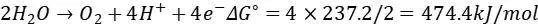 水分解反应的总自由能变为ΔG°=237.2 kJ/mol(2H₂O→2H₂+O₂)。