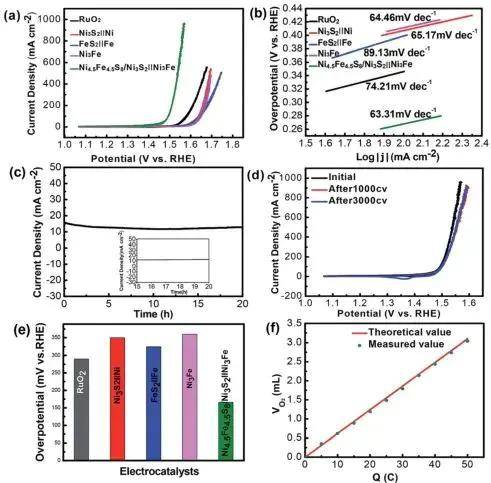 过电位(η)定义为η=E实际-1.23V(vs. RHE)。例如:商用IrO₂在10 mA/cm²时η≈300 mV;高效催化剂如NiFeOₓ可达η;Tafel斜率用于分析反应动力学机制。