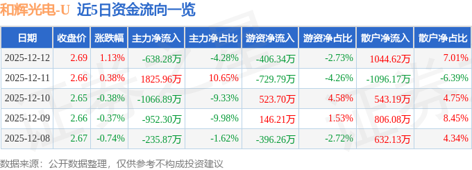 证券之星消息,截至2025年12月12日收盘,和辉光电(688538)报收于2.69元,上涨1.13%,换手率0.97%,成交量55.53万手,成交额1.49亿元。