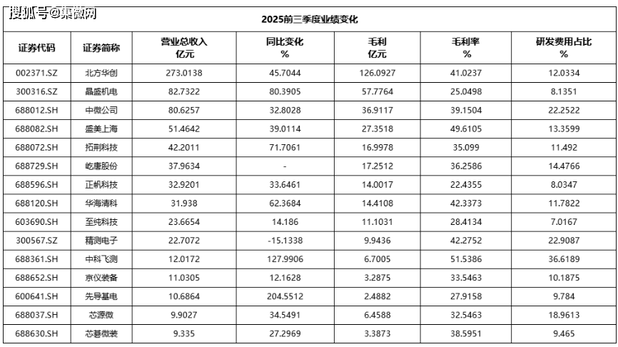 2025年前三季度,前道设备上市公司总收入约为732.20亿元,同比上涨51.42%(加权数据);毛利率平均值约为36.36%,研发占比平均值约为14.43%。