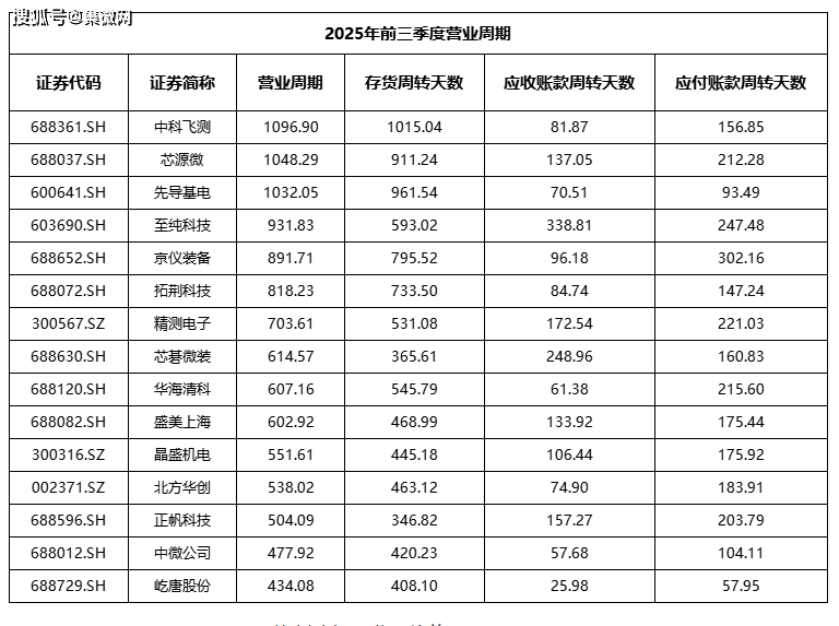 从营业周期来看,营业周期由长至短前三的是中科飞测、芯源微、先导基电。