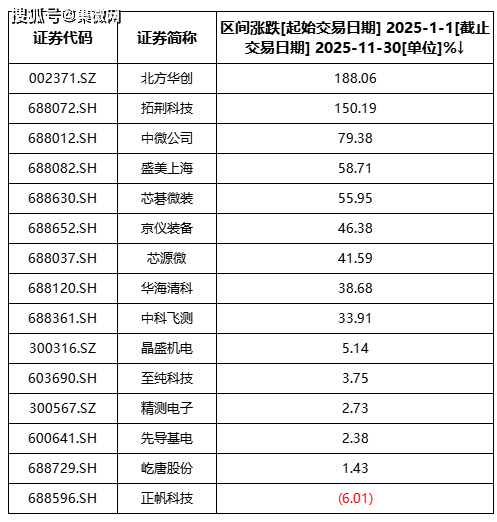 2025年,半导体前道设备行业股价表现多数收涨,截至11月30日,涨幅最高的公司是北方华创(188.06%),跌幅最高的公司是正帆科技(-6.01%)。