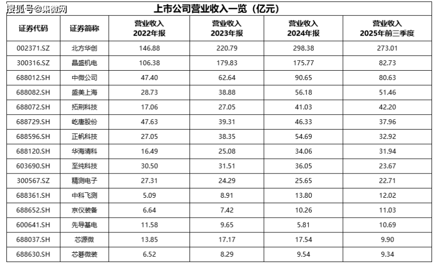 从营收表现来看,营业收入前三的企业分别是北方华创、晶盛机电、中微公司。