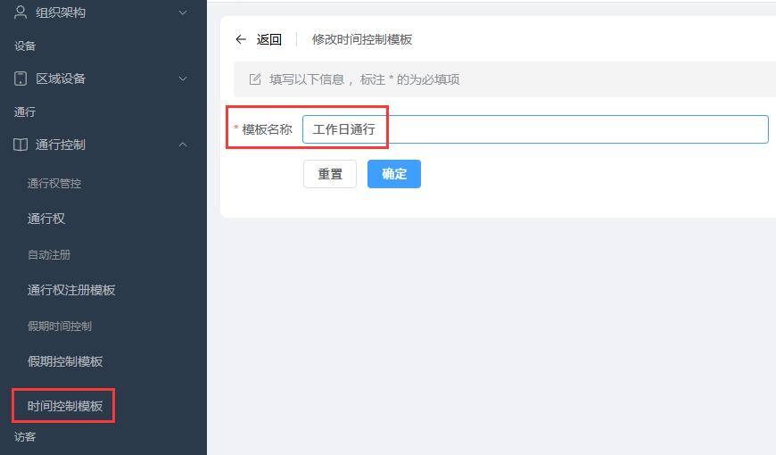 4.、接着在“时间控制模板“下新建”模板名称“为”工作日通行“,点确定并保存