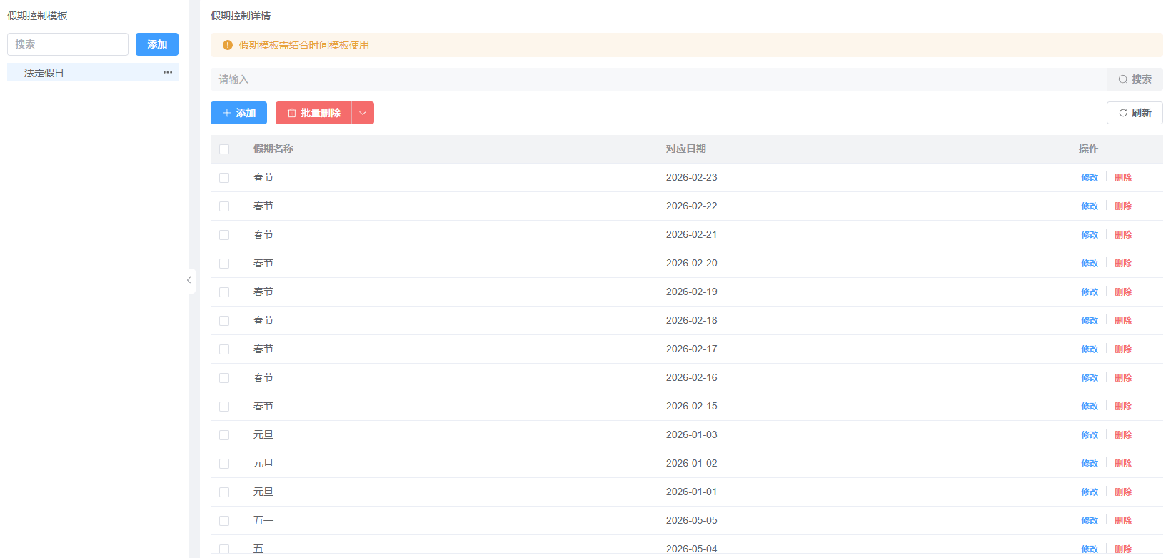 2、 点击刚刚新建的模板“法定假日”进入设置具体的法定假日,如:2026年春节假日,那我们就选择2026年2月15日——2026年2月23日,并点击“确定”保存,其他的假期建立也是如此,