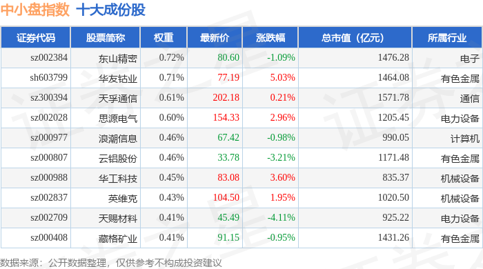 证券之星消息,1月7日,中小盘(399401)指数报收于5043.46点,涨0.62%,成交9096.15亿元,换手率2.45%。当日该指数成份股中,上涨的有307家,南大光电以20.0%的涨幅领涨,下跌的有477家,盛科通信以7.53%的跌幅领跌。