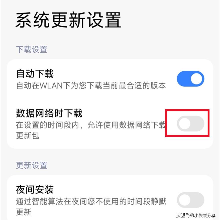 手机系统更新,分大更新和小更新,如果是小更新一般几十兆,大更新就需要几个G了,如果咱们没注意,没有把流量关掉,一旦进行更新了,那咱们的流量也会被消耗不少,所以我们要把在夜间更新和使用流量更新开关关掉,把仅在wifi下更新打开就可以了!