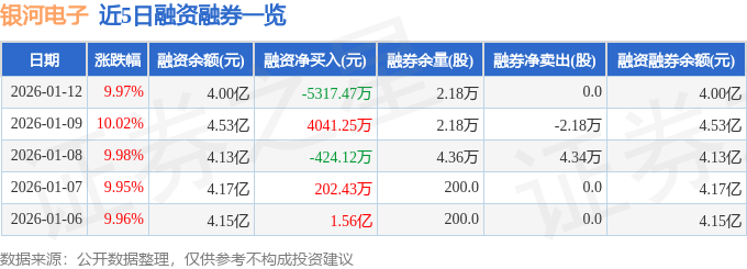 证券之星消息,截至2026年1月12日收盘,银河电子(002519)报收于11.47元,上涨9.97%,已连续涨停6天,换手率3.89%,成交量43.48万手,成交额4.98亿元。
