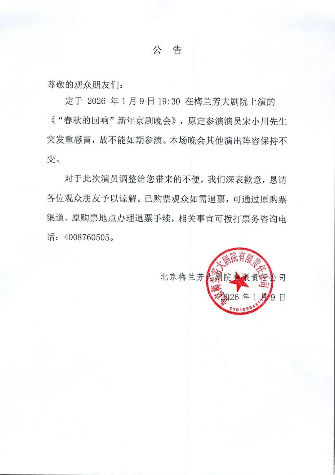 关于1月9日演出阵容变更的公告