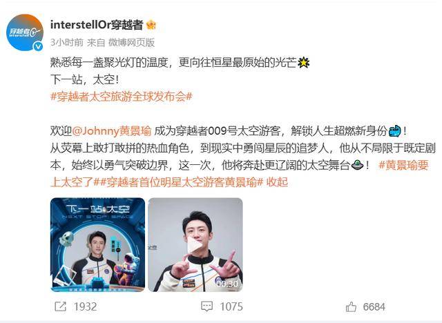 1月22日,@interstellOr穿越者 官宣@Johnny黄景瑜成为009号太空游客,黄景瑜在vcr中表示很荣幸成为一名太空旅客,将乘坐中国人自己的飞船亲身抵达那片星海。