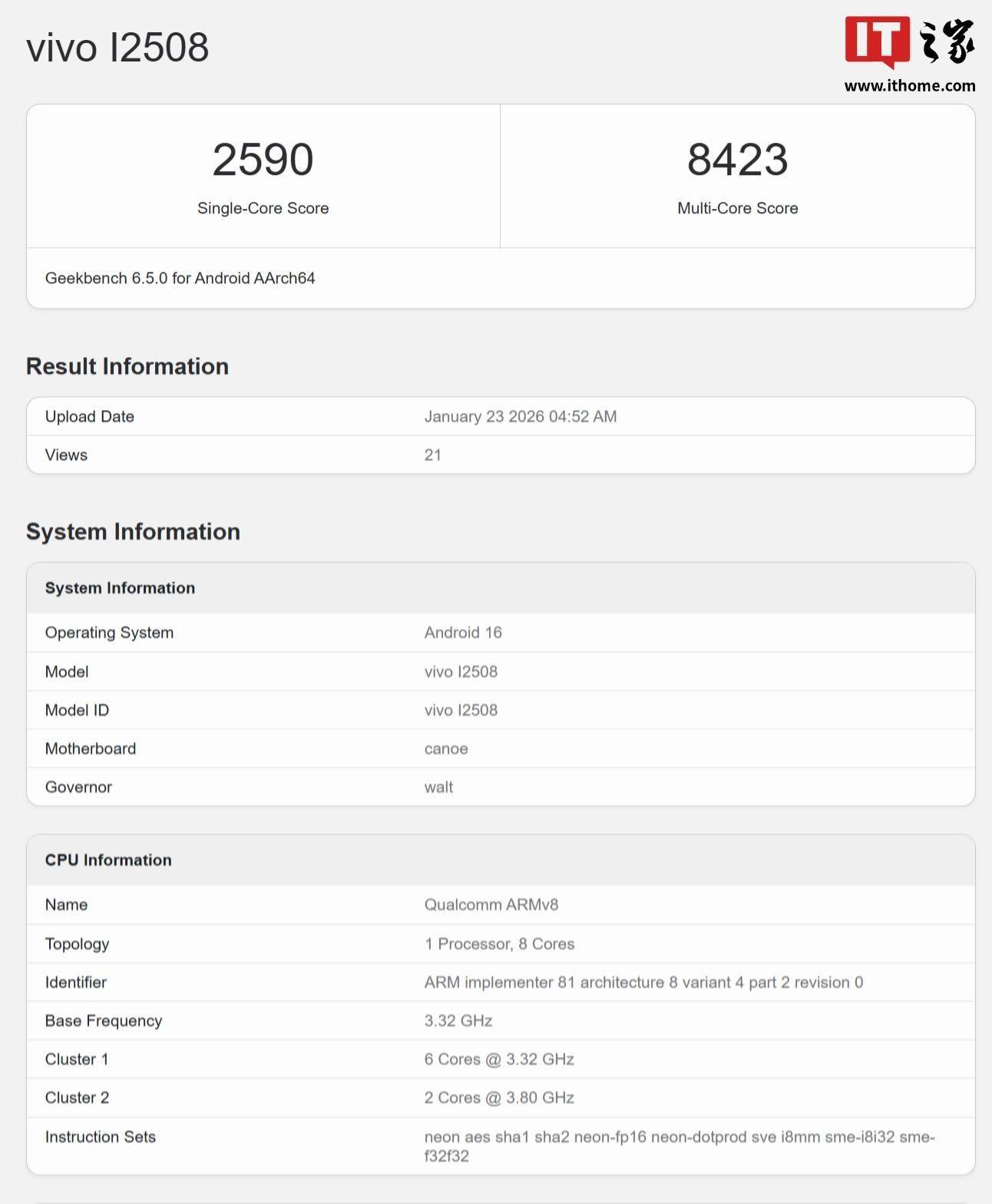 IT之家 1 月 24 日消息,一款型号为“I2508”的 iQOO 新机最近现身 Geekbench 跑分数据库,搭载高通骁龙 8 Gen 5(第五代骁龙 8)芯片,预计为 iQOO 15R。