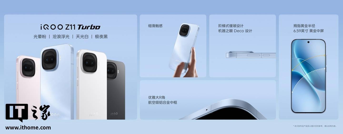据IT之家此前报道,iQOO Z11 Turbo 手机提供沧浪浮光、光晕粉、天光白、极夜黑四种配色,屏幕支持类 DC 调光 + 4320Hz 高频 PWM 调光,局部峰值亮度可达 5000 尼特,采用满血版 LPDDR5X Ultra 内存和最新 UFS 4.1 闪存,跑分高达 359W+,标价 2399 元起。