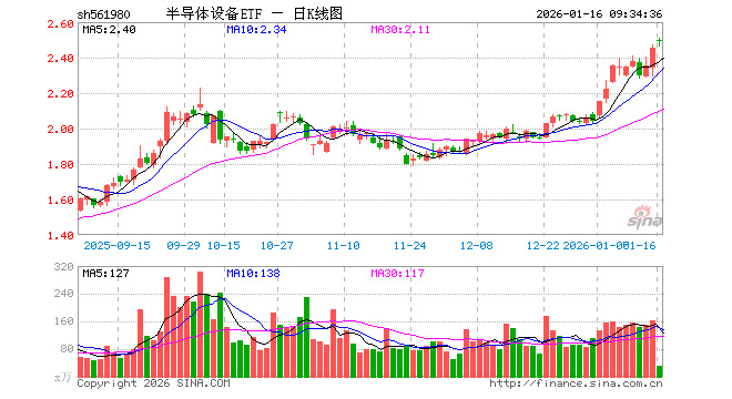 1月16日,半导体设备ETF(561980)开盘涨1.96%,报2.499元。半导体设备ETF(561980)重仓股方面,中微公司开盘涨1.62%,北方华创涨1.24%,寒武纪涨0.35%,中芯国际涨2.46%,海光信息涨1.08%,长川科技涨0.07%,华海清科涨1.94%,拓荆科技涨1.60%,南大光电涨1.99%,安集科技涨0.80%。