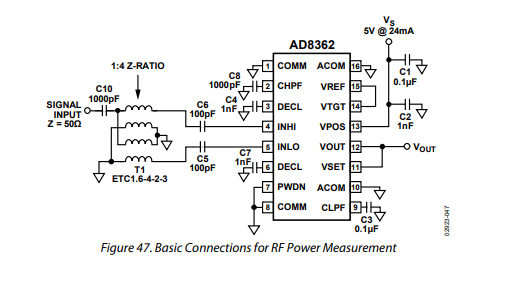 图47所示为将AD8362置于测量模式所需的基本连接。虽然AD8362需要标称5 V的单电源供电,但在±10%以内的电压波动对其性能几乎没有影响。选型→zywbic