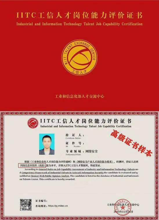学员完成全部课程并通过考试后,将获得《网络信息审核师岗位能力评价证书》,官方权威评价认证,证书可在工业和信息化部人才交流中心官网、工业和信息化人才评价系统查询。